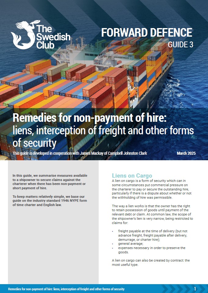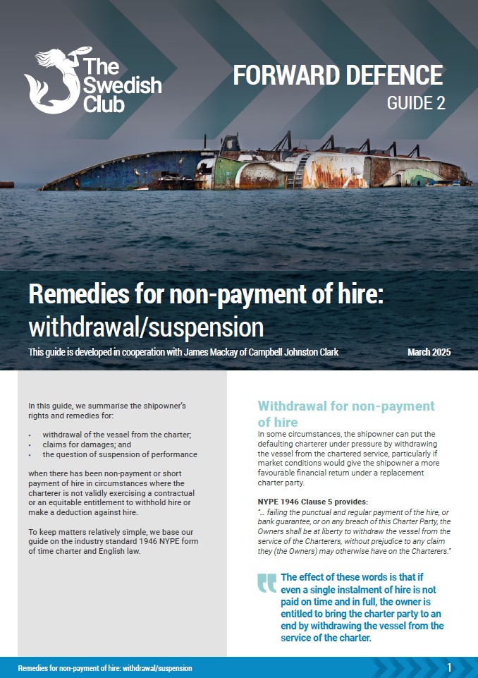 This Guide looks at the shipowner’s remedy of withdrawal/suspension of performance when a wrongful deduction from hire or short-payment occurs. Developed in collaboration with James Mackay of CJC (Campbell Johnston Clark)