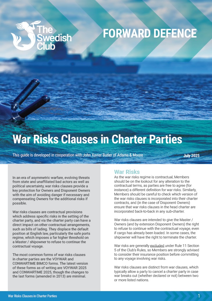 This Guide aims to provide an essential overview of war risks clauses in charter parties, explaining their purpose, key forms and practical implications for Owners and Disponent Owners. Developed in collaboration with John Butler of Adams & Moore.