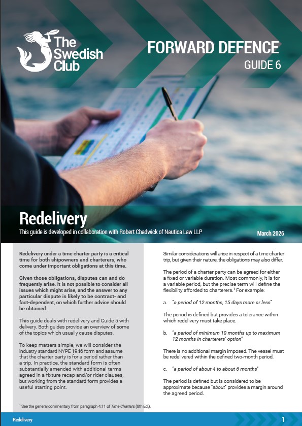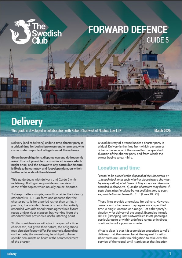 This guide deals with delivery, and Guide 6 with redelivery. Both guides provide an overview of some of the topics that usually cause disputes. Developed in collaboration with Robert Chadwick of Nautica Law LLP.