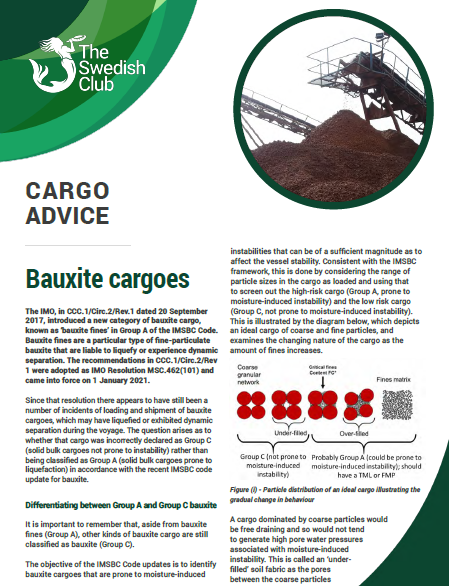The IMO, in CCC.1/Circ.2/Rev.1 dated 20 September 2017, introduced a new category of bauxite cargo, known as ‘bauxite fines’ in Group A of the IMSBC Code. Bauxite fines are a particular type of fine-particulate bauxite that are liable to liquefy or experience dynamic separation. The recommendations in CCC.1/Circ.2/Rev 1 were adopted as IMO Resolution MSC.462(101) and came into force on 1 January 2021.