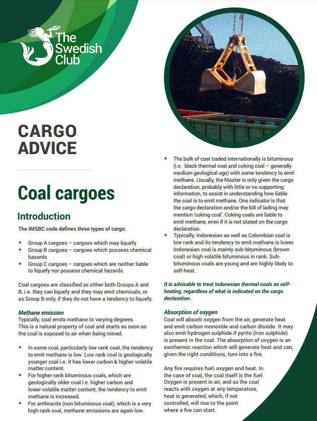 The IMSBC code defines three types of cargo: group A cargoes – cargoes which may liquefy, group B cargoes – cargoes which possess chemical hazards and group C cargoes – cargoes that are neither liable to liquefy nor possess chemical hazards. Coal cargoes are classified as either both Groups A and B, i.e. they can liquefy and they may emit chemicals, or as Group B only, if they do not have a tendency to liquefy.
