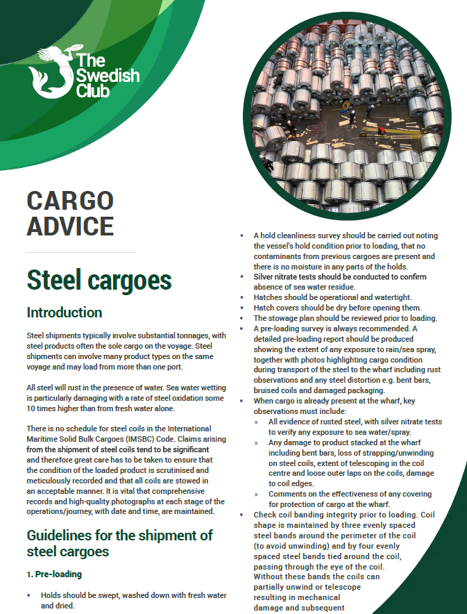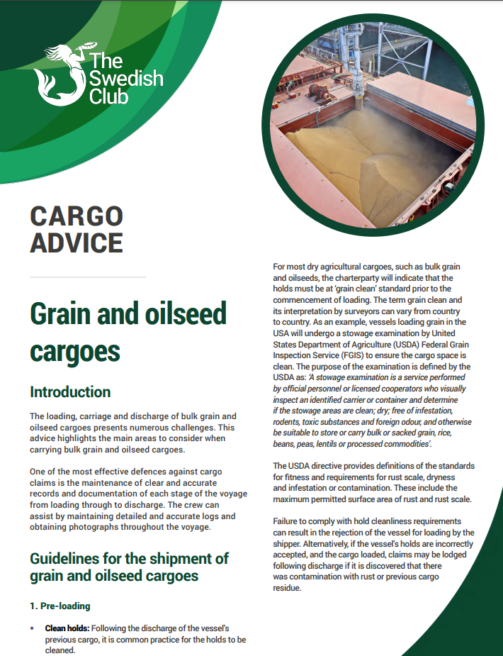 The loading, carriage and discharge of bulk grain and oilseed cargoes present numerous challenges. This advice highlights the main areas to consider when carrying bulk grain and oilseed cargoes. One of the most effective defences against cargo claims is the maintenance of clear and accurate records and documentation of each stage of the voyage from loading through to discharge. The crew can assist by maintaining detailed and accurate logs and obtaining photographs throughout the voyage