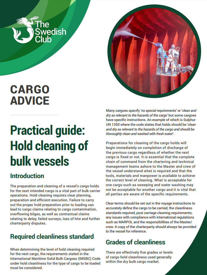 The preparation and cleaning of a vessel’s cargo hold for the next intended cargo is a vital part of bulk carrier operations. Hold cleaning requires clear planning, preparation and efficient execution. Failure to carry out the proper hold preparation prior to loading can lead to cargo claims relating to cargo contamination, overflowing bilges as well as contractual claims relating to delay, failed surveys, loss of hire and further Charterparty disputes.