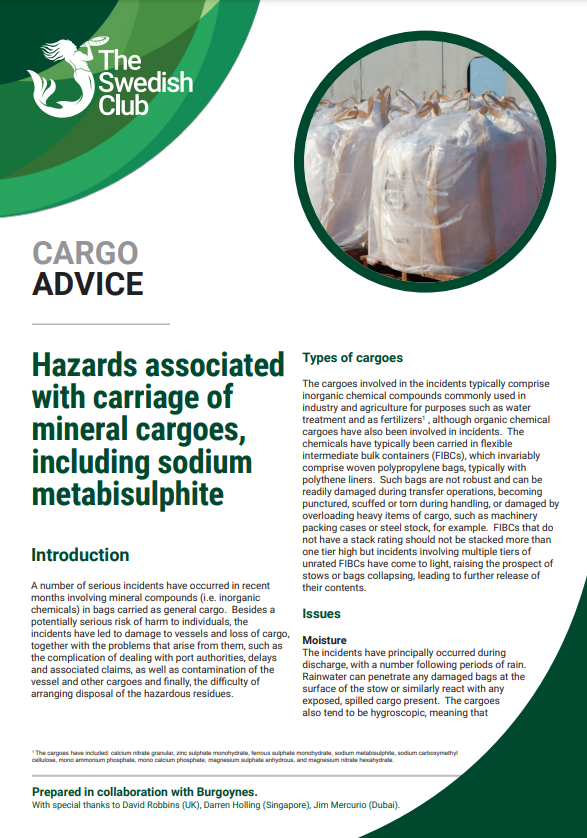 A number of serious incidents have occurred in recent months involving mineral compounds (i.e. inorganic chemicals) in bags carried as general cargo. Besides a potentially serious risk of harm to individuals, the incidents have led to damage to vessels and loss of cargo, together with the problems that arise from them, such as the complication of dealing with port authorities, delays and associated claims, as well as contamination of the vessel and other cargoes and finally, the difficulty of arranging disposal of the hazardous residues