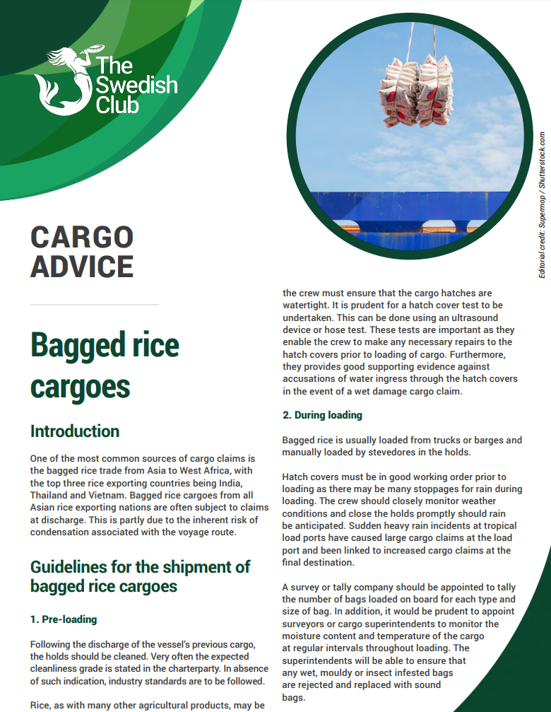 One of the most common sources of cargo claims is the bagged rice trade from Asia to West Africa. The top three rice exporters are India, Thailand and Vietnam. Bagged rice cargoes from all Asian rice exporting nations are often subject to claims at discharge. This is partly due to the inherent risk of condensation associated with the voyage route.