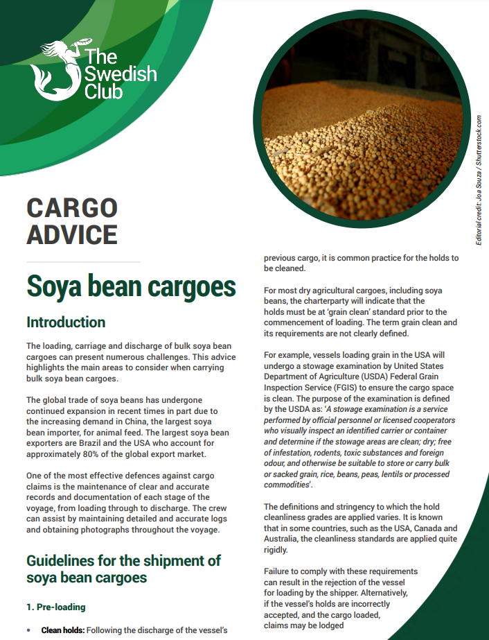 The loading, carriage and discharge of bulk soya bean cargoes can present numerous challenges. This advice highlights the main areas to consider when carrying bulk soya bean cargoes. The global trade of soya beans has undergone continued expansion in recent times in part due to the increasing demand in China, the largest soya bean importer, for animal feed. The largest soya bean exporters are Brazil and the USA who account for approximately 80% of the global export market.