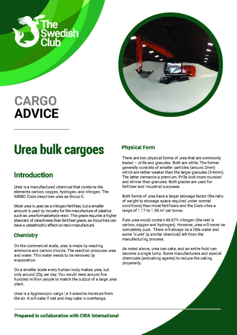 Urea is a manufactured chemical that contains the elements carbon, oxygen, hydrogen, and nitrogen. The IMSBC Code describes urea as Group C. Most urea is used as a nitrogen fertiliser, but a smaller amount is used by industry for the manufacture of plastics such as urea-formaldehyde resin. This grade requires a higher standard of cleanliness than fertiliser grade, as impurities can have a catastrophic effect on resin manufacture.Practical Guides