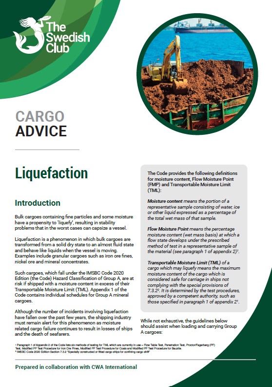 Liquefaction is a phenomenon in which bulk cargoes are transformed from a solid dry state to an almost fluid state and behave like liquids when the vessel is moving. Examples include granular cargoes such as iron ore fines, nickel ore and mineral concentrates.