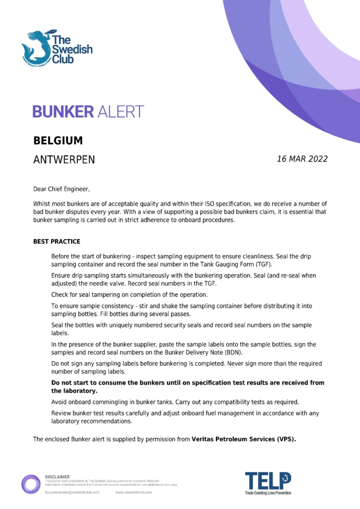 Bad bunker is a common cause of engine failures. Our Bunker alerts help members to avoid bunkering off-specification fuel. The Swedish Club has partnered with Veritas Petroleum Services (VPS). As soon as VPS gets an indication that bad bunkers are being supplied in a certain port, we alert our TELP vessels heading for that area.