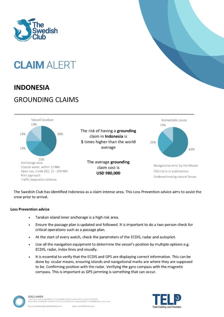 Our Claim alerts are based on The Swedish Club’s claims statistics. By comparing where claims occur with our members’ trading pattern, we have identified areas around the world where the risk of suffering a claim is higher than the world average. The Claim alert includes loss prevention advice based on the Club’s experience dealing with claims in the area. It also includes information on the particular risk provided by our correspondent.