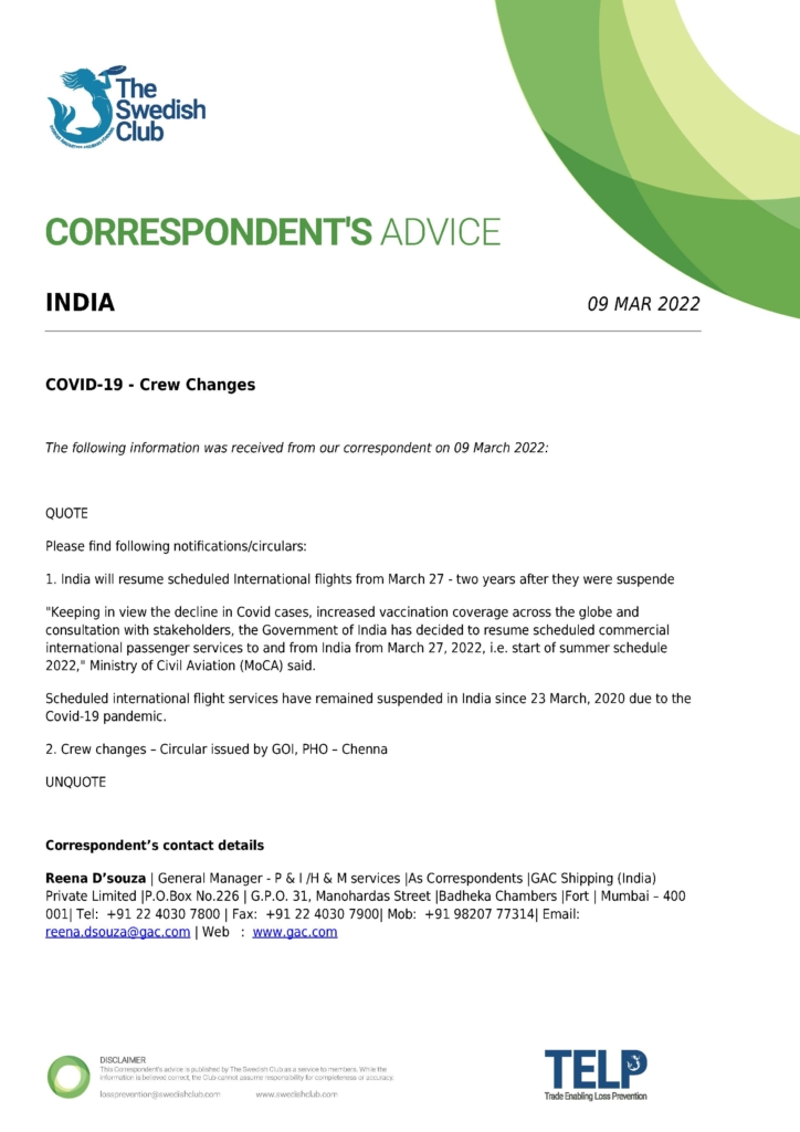 Our global network of correspondents provides information on local conditions relevant to the daily operation of a vessel. It can be information on health issues, disruptions in a port’s cargo handling or specific navigational warnings. TELP enables us to automatically share this essential information with our TELP members through the Correspondent’s advice.