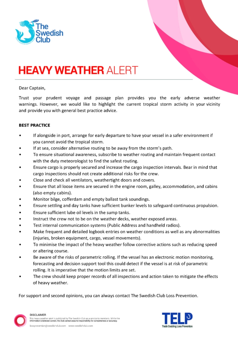Our latest addition to TELP offering – Heavy Weather Alert. Based on the vessel’s position, in combination with weather data, this new feature will provide our members with timely loss prevention advice based on severe weather patterns in their vessels’ vicinity.