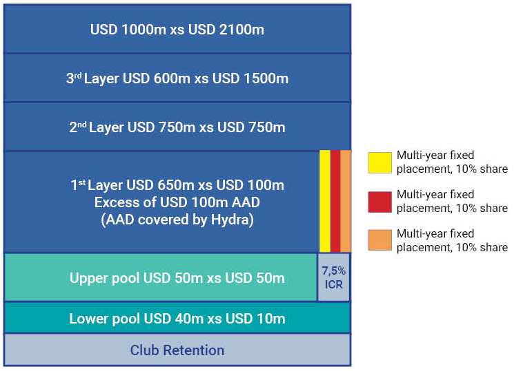 As is discussed elsewhere (see Part One, Sections B.3, B.4 and B.5), the Club pools, i.e. agrees to share, with the other parties to the Pooling Agreement that part of any claim which is in excess of a retention (USD 10 million for the policy year 2021/2022). The parties to the Pooling Agreement have collectively purchased reinsurances from the insurance market under the terms of the Group General Excess Loss Contract. For the policy year 2021/2022, the layer is from USD 100 million to USD 3.1 billion.